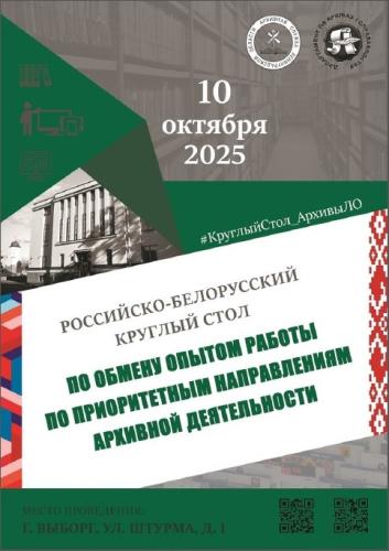 10 кастрычніка 2025 г. намеснік дырэктара Сяргей Рындзін прыняў удзел у рабоце расійска-беларускага Круглага стала па абмене вопытам работы па прыярытэтных пытаннях архіўнай дзейнасці (г. Выбарг, Расійская Федэрацыя), арганізатарамі якога выступілі Архіўнае ўпраўленне Ленінградскай вобласці і Дэпартамент па архівах і справаводству Міністэрства юстыцыі Рэспублікі Беларусь.