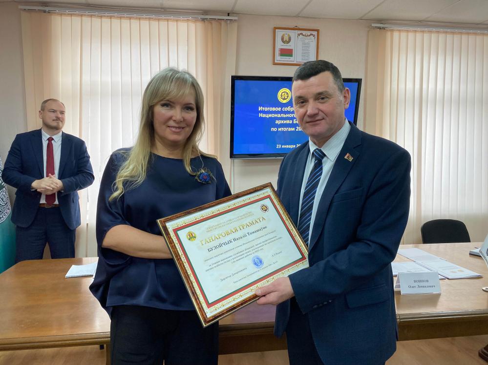 Узнагароджанне Ганаровай граматай Дэпартамента па архівах і справаводству Міністэрства юстыцыі Рэспублікі Беларусь намесніка дырэктара архіва Н.Т. Булойчык