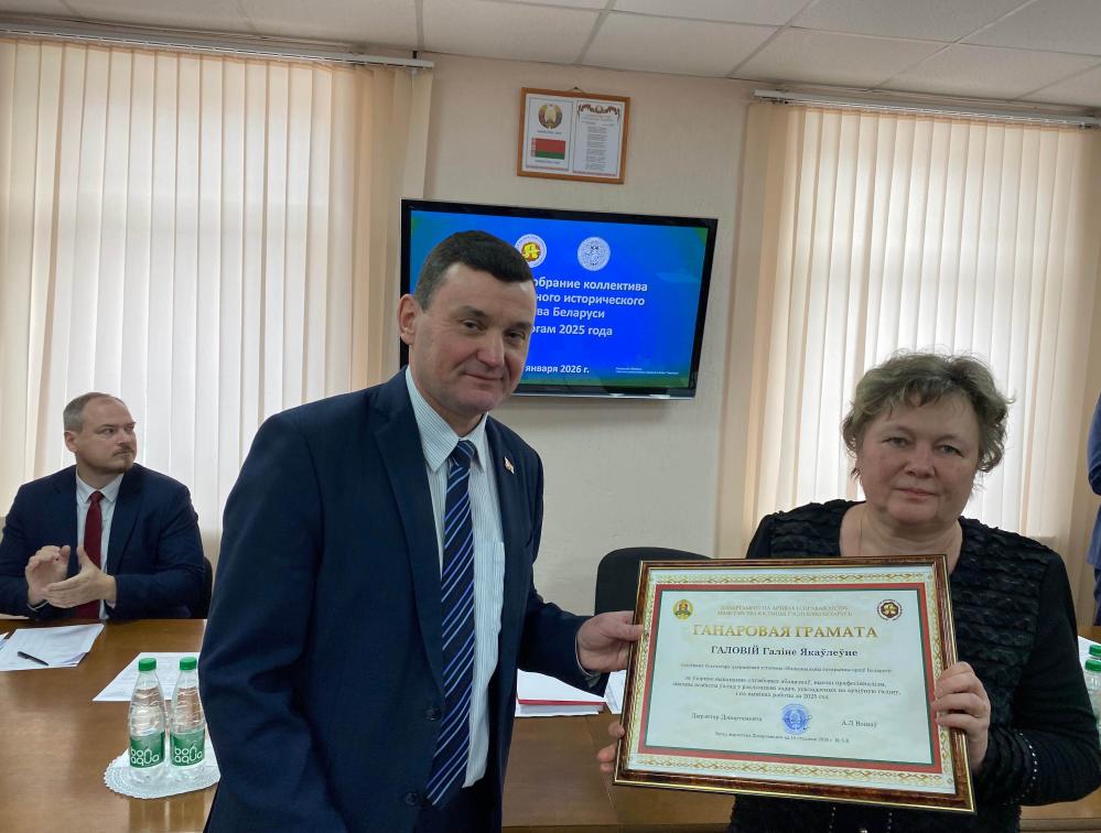 За добрасумленную і плённую працу, высокі прафесіяналізм, узорнае выкананне службовых абавязкаў Ганаровай граматай Нацыянальнага гістарычнага архіва Беларусі ўзнагароджаны: