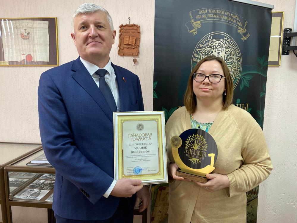 Узнагароджанне Ганаровай граматай НГА Беларусі вядучага навуковага супрацоўніка Ю.І. Мазанік. Пераможца конкурсу «Генеалогія года ў НГА Беларусі» (1 месца)