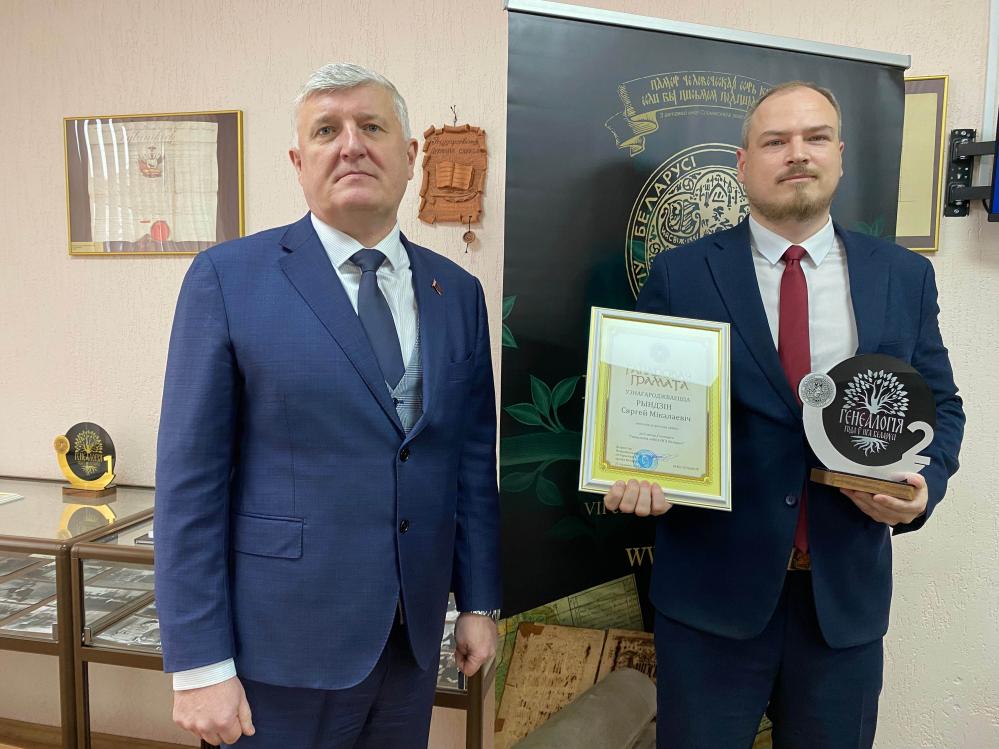 Узнагароджанне Ганаровай граматай НГА Беларусі намесніка дырэктара архіва С.М. Рындзіна. Пераможца конкурсу «Генеалогія года ў НГА Беларусі» (2 месца)