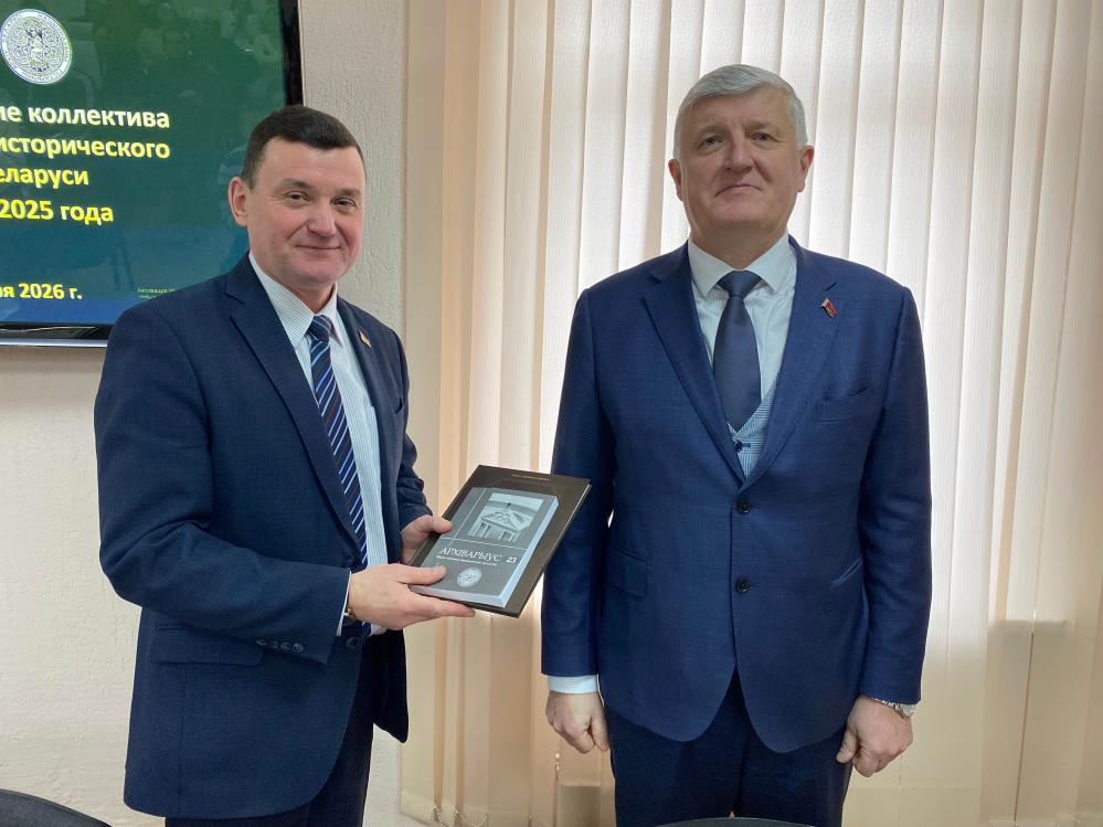 Пасля ўрачыстага ўзнагароджання работнікаў архіва Міхаіл Глушакоў уручыў Алегу Воінаву кніжныя выданні НГА Беларусі, якія выйшлі з друку ў 2025 годзе.